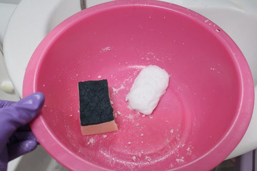 수세미에 물때비누를 묻혀 욕실거울을 닦아 주세요. 때가 많지 않다면 부드러운 스펀지 부분으로 닦아 주면 되고요. 때가 많이 끼었다면 까칠한 부분에 물때비누 묻혀서 닦으면 됩니다. 여기서 중요한 포인트! 꼭 유리엔 물기가 있어야 기스가 나지 않습니다.