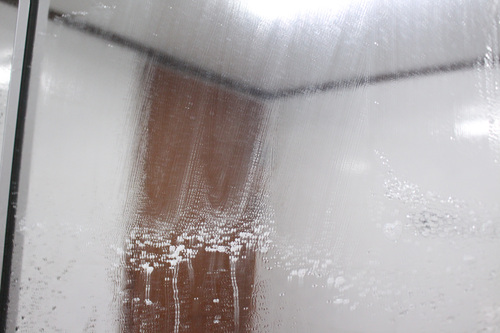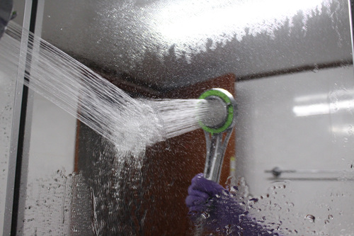 닦은 후에는 샤워기를 이용해 헹궈주면 됩니다. 물때가 많이 끼었다면 물때비누로 한 번 더 문질러주면 됩니다.