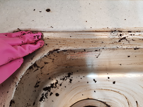 원두커피찌꺼기를 물이 없는 상태에서 싱크대 곳곳을 꼼꼼히 문질러 주세요.