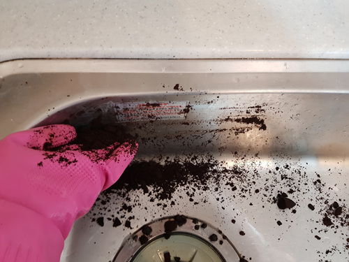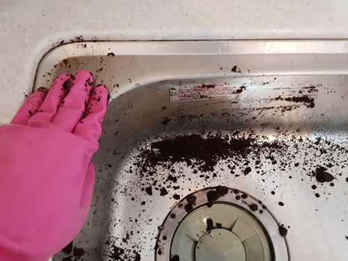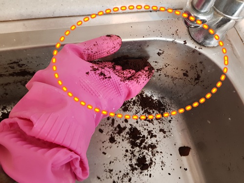 원두커피찌꺼기를 물이 없는 상태에서 싱크대 곳곳을 꼼꼼히 문질러 주세요.