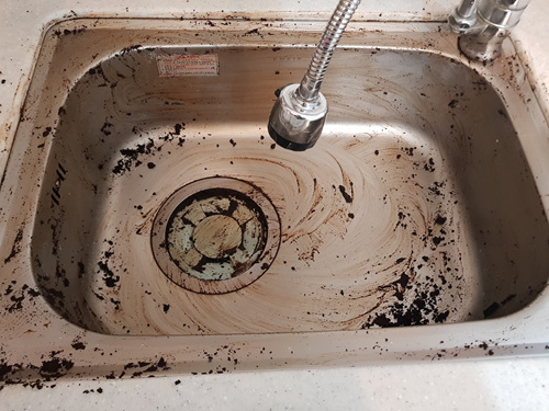 원두커피찌꺼기를 싱크대 주변을 다 문질렀으면 물로 깨끗이 닦으면서 헹궈 주시면 됩니다.