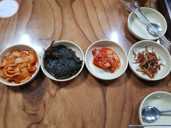동태찌개를 주문하면 반찬은 4종류 나옵니다. 제철 반찬도 나오긴 하지만 어묵반찬과 김치, 깻잎은 항상 나오는 반찬이고 한가지가 조금씩 변하기도 해요. 동태찌개 가격은 8,000원입니다. (공기밥 추가 공짜)