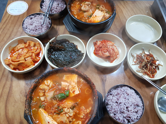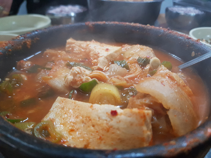 고추가루가 들어간 것은 칼칼하니 맛있더라고요. 무엇보다도 뚝배기도 작지 않은데 어찌나 내용물이 푸짐한지 처음 보시면 놀라는 분들이 많습니다. 저희도 그랬으니까요. 6년 단골이 되다 보니 사장님 알아서 밥 2그릇을 처음부터 올려 줍니다. 정말 정이 많고 살뜰한 사장님이지요. 한 번 드셔 보시면 아시겠지만 마치 집밥 같은 느낌도 많이 드는 그런 음식점입니다.