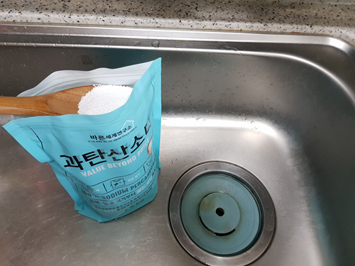 과탄산소다는 조금 넉넉하게 싱크대 개수대 통 부근에 솔솔 뿌려 주세요. 전 나무주걱에 한 스푼 반 정도 사용했어요.