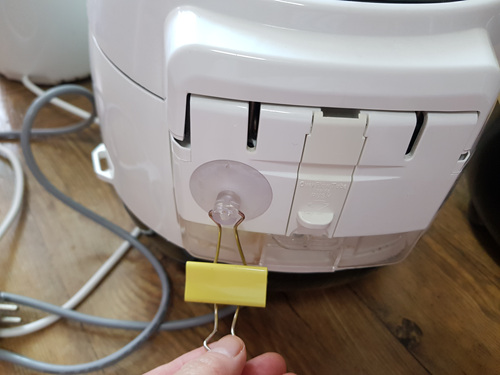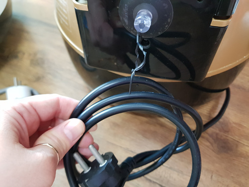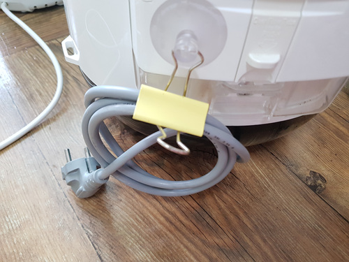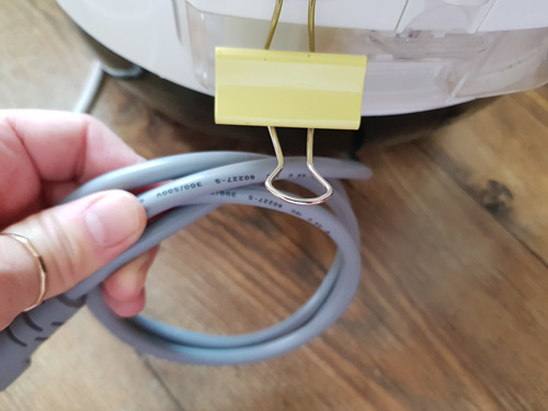 문구용 집게를 연결한 뽁뽁이를 가전제품에 부착한뒤 전선을 돌돌말아 집게로 집어 주세요.