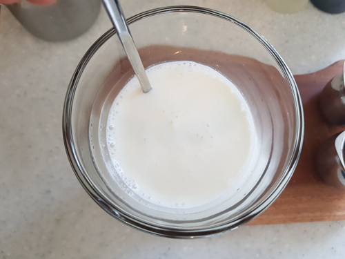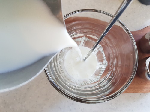 그 다음 우유를 넣은 뒤 연유와 잘 섞어 주세요.