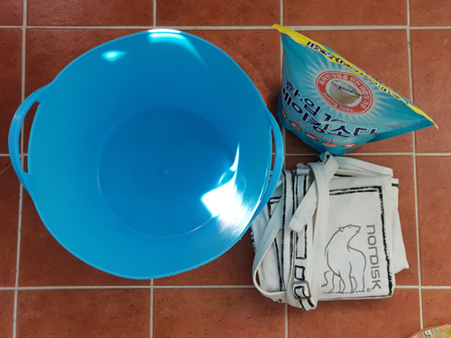전 이렇게 담궈 두고 세탁기에 다른 의류와 함께 돌렸어요. 물론 세탁망에 앞치마를 넣은 뒤 말이죠.