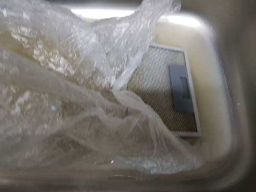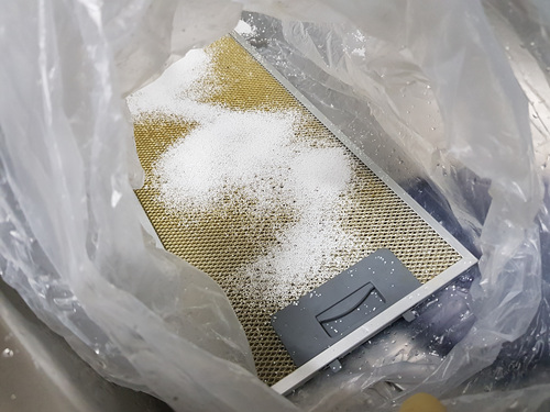 뜨거운 물과 과탄산소다가 만나니 부글부글 끓으면서 후드에 묻어 있는 기름기를 녹여 주면서 세척이 됩니다. 비닐봉지를 묶은 채 약 10분 정도만 그대로 둔 뒤 뜨거울 때 솔로 한 번 더 닦아주면 됩니다.