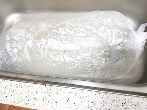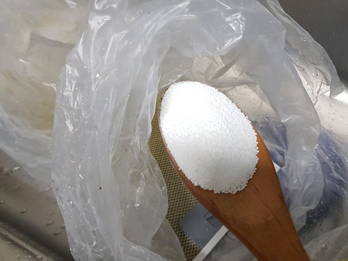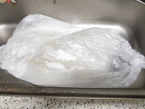 비닐에 뜨거운 물을 부어 재빨리 입구를 묶어 줍니다. 과탄산소다를 사용할 때는 꼭 환기 필수입니다. 물론 고무장갑 착용 필수이고요.