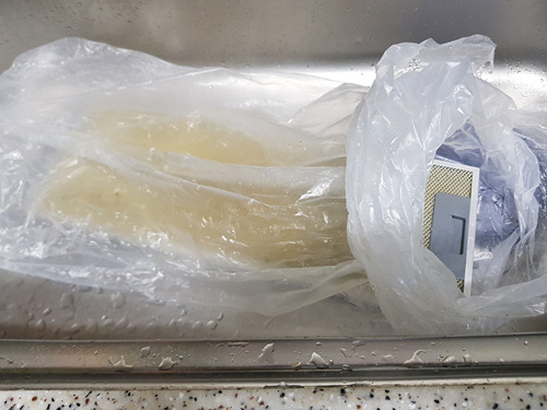 10분 후 비닐봉지를 열어 보니 기름이 많이 녹아 흘러내린 모습이었습니다.
