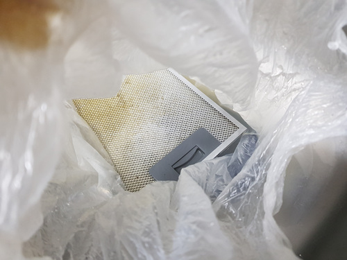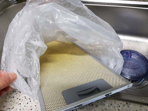 이제 본격적으로 기름기 가득한 후드를 세척할 건데요. 먼저 큰 비닐을 준비해 주세요. 후드가 들어갈 수 있는 크기면 됩니다.