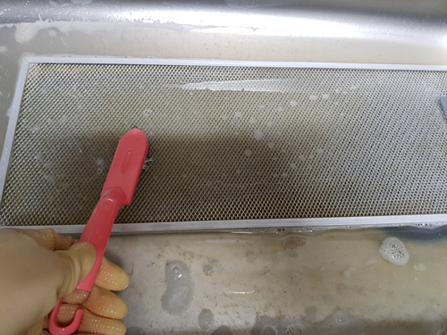 마지막으로 꼼꼼하게 솔을 이용해 세척해주면 정말 깔끔한 후드가 됩니다.