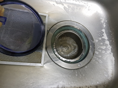 물이 정말 더러워졌네요. 후드에 묻은 기름기도 자연스럽게 많이 제거된 모습이고요.