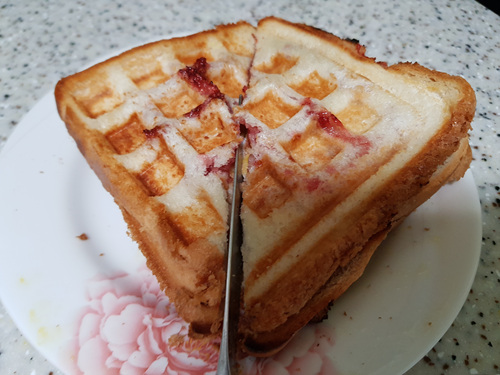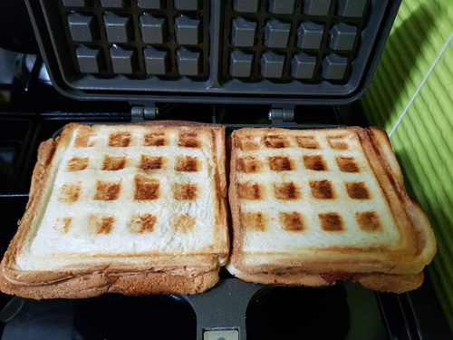 버터를 바른 빵에 달걀후라이 올리고 그 위에 딸기잼을 올렸어요. 바삭하게 먹기 위해 전 와플팬으로 만들어 먹기로 했지요.