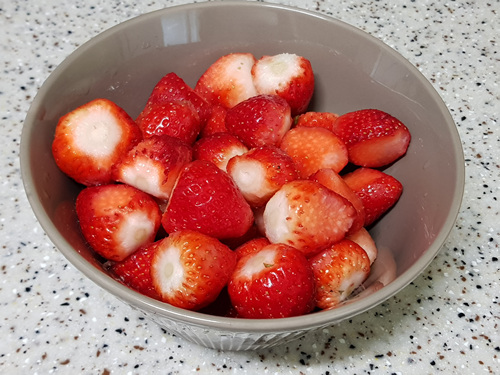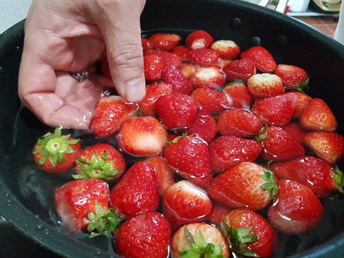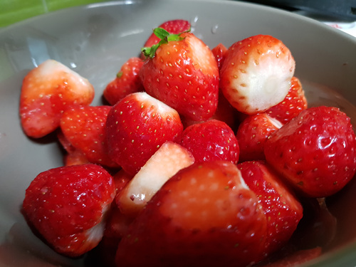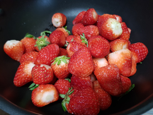 괜찮은 딸기는 따로 통에 담고 나머지는 꼭지를 따서 딸기잼을 해 먹기로 했네요. 양이 많아 이대로 그냥 뒀다간 반나절만에 다 물러질 상황이라 얼른 잼을 만들기로 ..