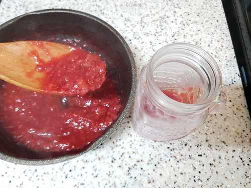 딸기잼을 다 만들었으면 열탕 소독된 유리병에 뜨거울때 넣어 주세요.