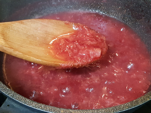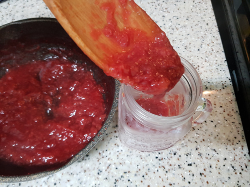 진득한 상태로 딸기잼을 졸인 후 한 번 더 물에 넣으면 딸기잼이 퍼지지 않고 그냥 떨어져 그대로 있어요. 그럼 농도가 잘 된 상태가 됩니다. 그럼 불을 끄면 되요.