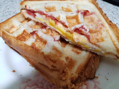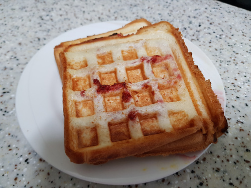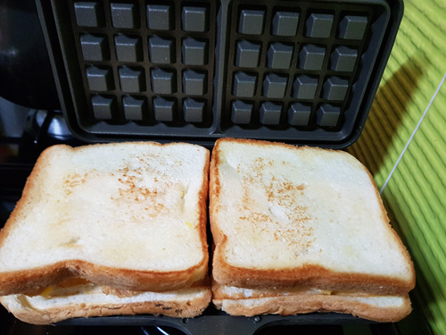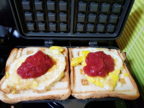 버터를 바른 빵에 달걀후라이 올리고 그 위에 딸기잼을 올렸어요. 바삭하게 먹기 위해 전 와플팬으로 만들어 먹기로 했지요.