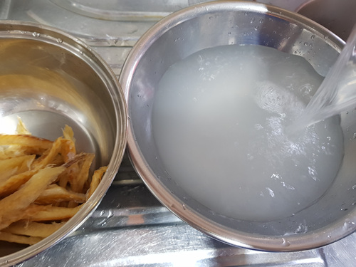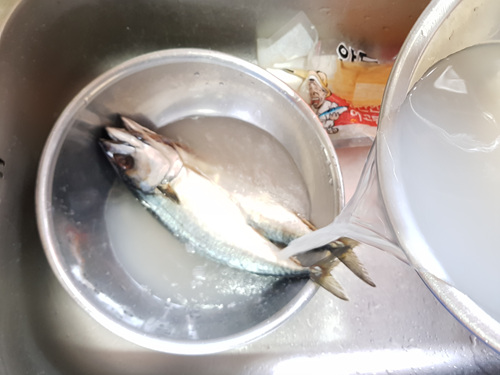 전 간고등어를 헹구기 전에 쌀뜨물에 담궈 둡니다. 약 10분 만 담궈 두어도 비린내는 물론 짜지 않게 고등어 구이를 해 먹을 수 있습니다.