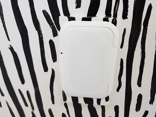 희한하게 물티슈 뚜껑이 콘센트 뚜껑에 딱 맞아요. 접착력이 없다면 양면 테이프를 이용해 붙여 주면 됩니다.