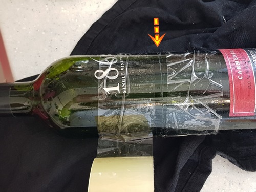 금이 나있는 와인병 주변에 테이프를 이용해 한 번 감아 주세요. 이렇게 테이프를 감아 주는 이유는 집중적으로 금이 난 부분에 뜨거운물을 부어 주기 위함입니다. 그래야 다른 부분에 손상이 없어요.