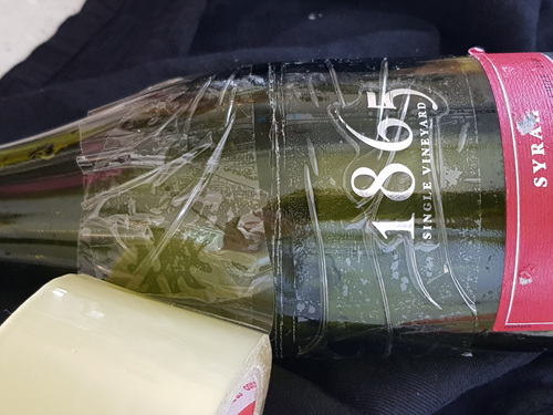 와인병이 잘라진 후에는 테이프를 떼어 내면 됩니다. 테이프를 너무 오랫동안 떼지 않으면 자국이 생기니 바로 떼어내 주세요.