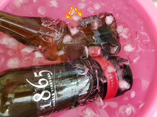 먼저 얼음물에 와인병을 담근 뒤 약 20초 후...