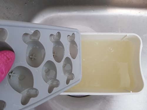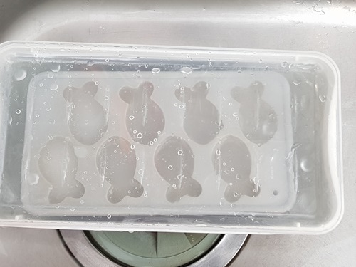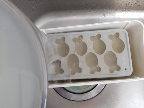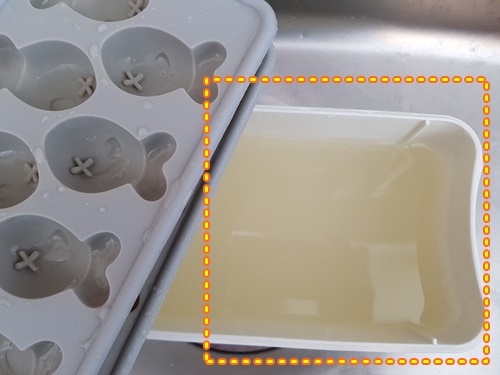 그 다음 준비해 놓은 쌀뜨물을 얼음트레이를 담아 놓은 곳에 충분히 잠길 정도로 부어 주세요.