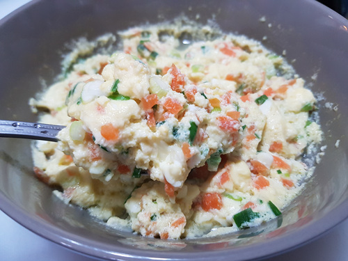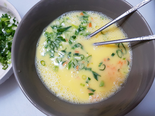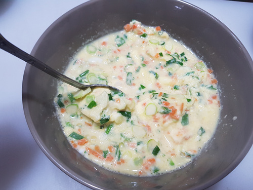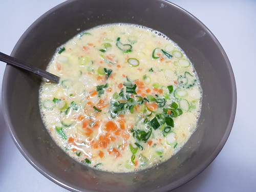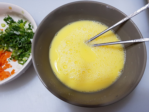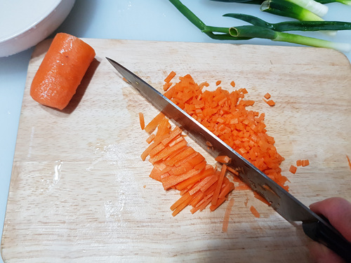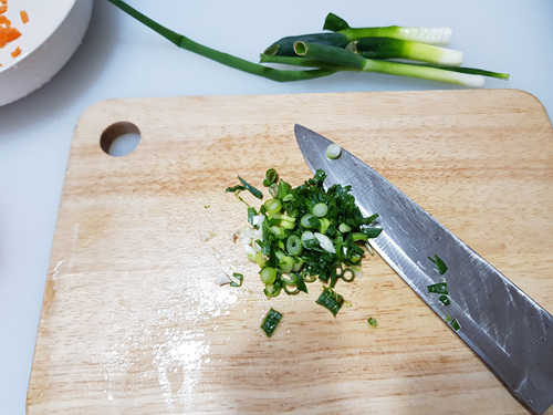 각종 채소는 잘게 썰어서 준비해 주세요. 전 당근이랑 대파를 준비했어요. 양파나 다른 채소들을 넣으셔도 됩니다.