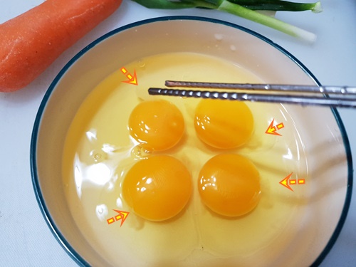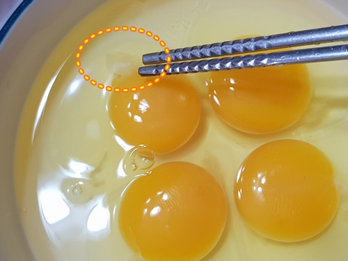 달걀 4개를 그릇에 넣어 주시고 흰자에 붙어 있는 알끈을 제거해 주세요.