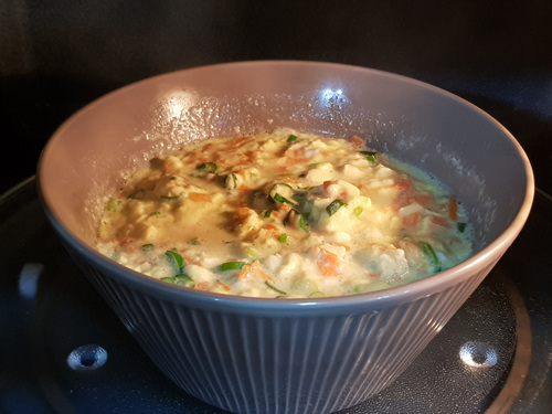 3분 정도 돌린 후에 윗부분의 달걀이 익었을때 숟가락으로 전체를 섞어 주세요. 안쪽 부분은 안 익은 상태거든요.