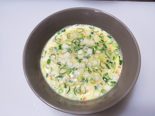 달걀에 채소를 절반 정도만 넣은 뒤 잘 섞어 주세요. 그리고 전자레인지에 넣어 3분 정도 돌려줍니다