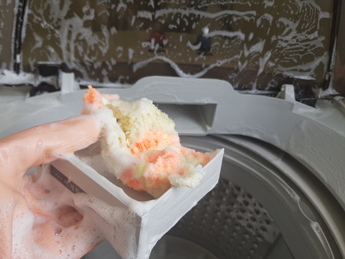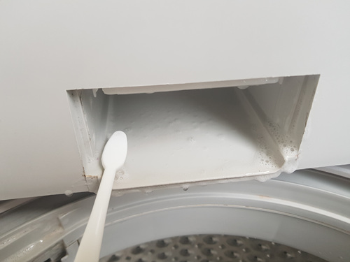 세제통 내부도 칫솔을 이용해 닦았어요. 생각보다 때가 잘 지워지기 때문에 몇 번만 문지르면 깨끗해져요.