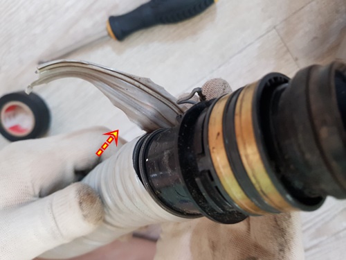 자른 줄은 버리고 아랫부분의 줄을 위로 돌돌 말아 올리듯이 조심스레 끼웠습니다. 혹시나 전선이 연결된 접지 부분이 다칠까봐 말이죠.