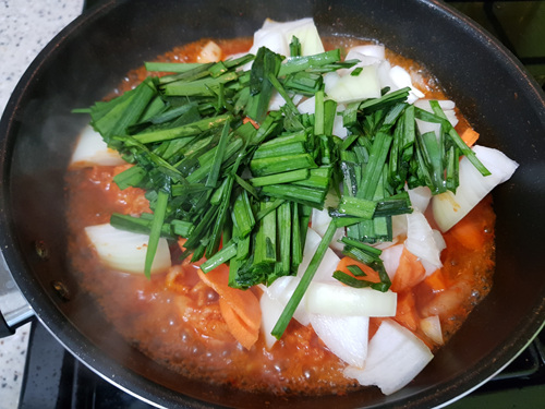 전 부추, 당근, 양파를 넣어 조리해 먹기로 했어요.