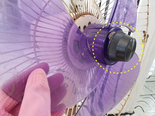 선풍기 주변은 손 소독제로 닦고 선풍기 망이나 날개는 세제를 이용해 스펀지로 깨끗이 닦았어요.