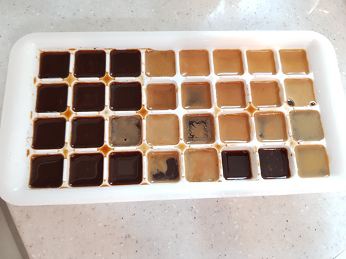 커피를 틀에 부어줄때는 너무 가득 넣지 말고 조금 부족하다 싶을 정도의 양이면 나중에 얼렸을때 모양이 서로 들러 붙지 않고 이쁘게 나와요.