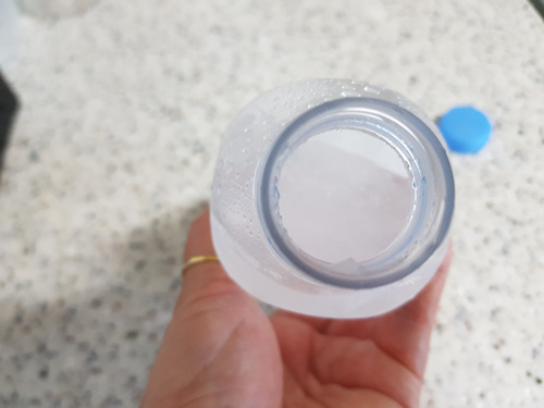 입구 부분에 구멍이 생길 정도로 비스듬히 눕혀 얼리면 됩니다. 왜 이렇게 물을 얼려야 할까? 물이 언 공간 외에 빈 공간에 물을 채워 넣기 위함입니다.