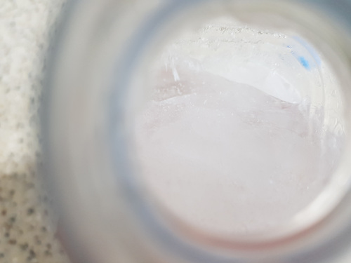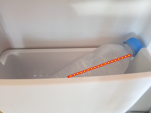 입구 부분에 구멍이 생길 정도로 비스듬히 눕혀 얼리면 됩니다. 왜 이렇게 물을 얼려야 할까? 물이 언 공간 외에 빈 공간에 물을 채워 넣기 위함입니다.