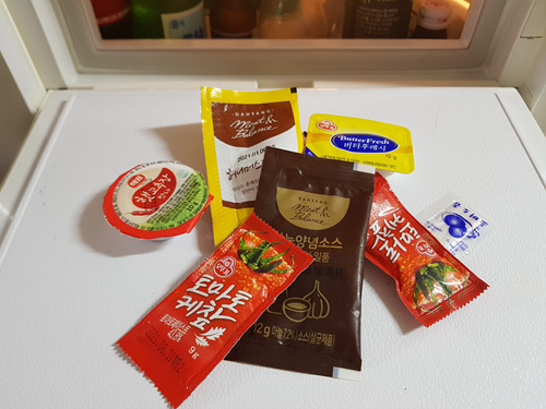 그리고 1회용 소스나 양념등은 보이는 통에 한꺼번에 넣어 보관하면 찾기 쉽습니다.