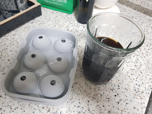 커피가 좀 식었으니 얼음을 넣어 시원하게 마시기로 했습니다.