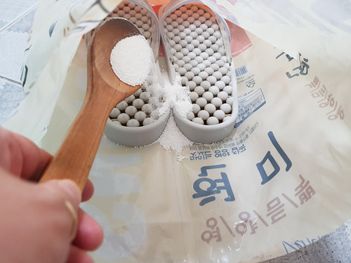 욕실슬리퍼를 넣은 뒤에 과탄산소다를 한 스푼 넣습니다. 주걱으로 전 넣었는데요. 숟가락으로 하면 한 2 ~ 3스푼 정도 될 것 같아요. 만약 저보다 더 심한 곰팡이라면 더 넣어야겠죠.. ^^;;;;