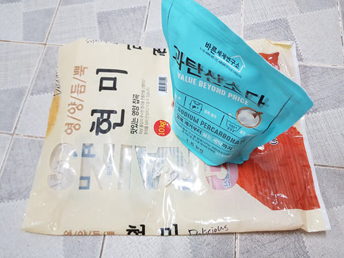 욕실슬리퍼를 세척하기 위해서 꼭 필요한 것이 있는데요. 큰 비닐봉지와 과탄산소다입니다.