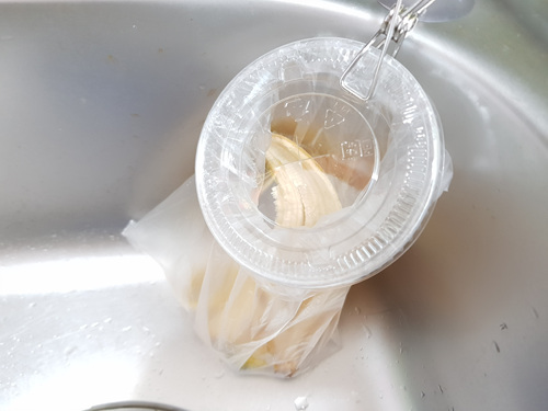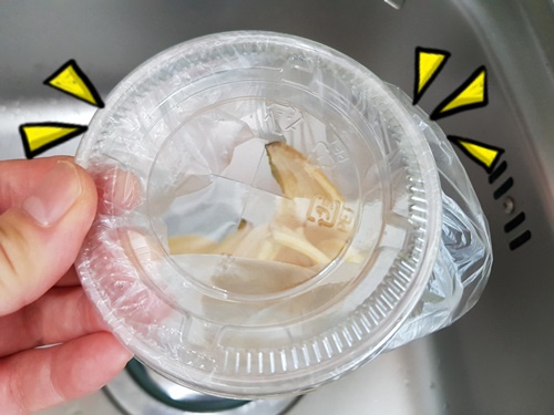자....이제 음식물쓰레기 통을 만들어 볼께요. 테이크아웃 컵 부분에 1회용 위생팩을 넣어 주세요.