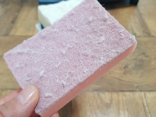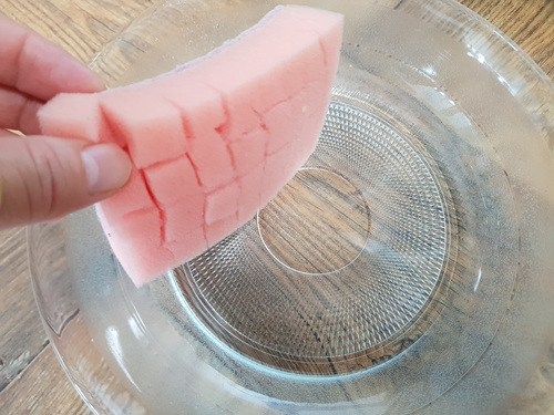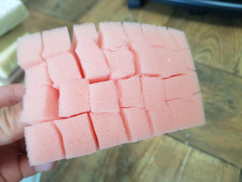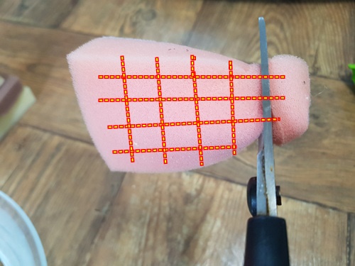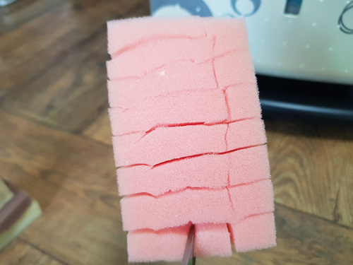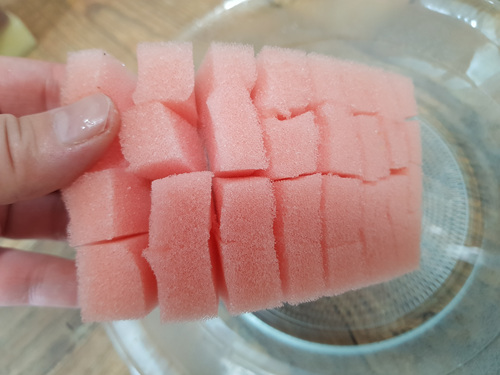 먼저 수세미 안쪽 스펀지 부분을 가로 세로로 잘라주세요. 단, 스펀지 부분만 ..