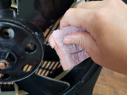 조금 비뚤어진 모습이지만 이렇게 한 뒤 물을 묻혀 꾹 짠 후 먼지 가득한 선풍기를 닦으면 됩니다.