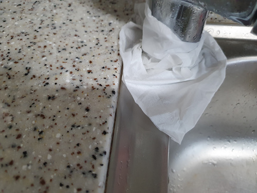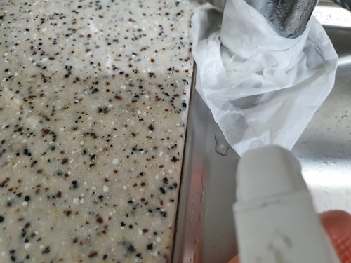 티슈를 올린 후 락스를 티슈에 뿌려 적셔 주세요. 참고로 락스 사용시 마스크 꼭 착용하시고요. 환기 필수입니다.