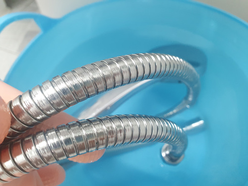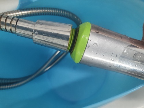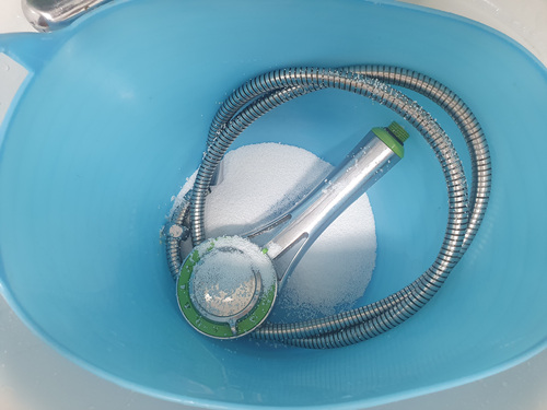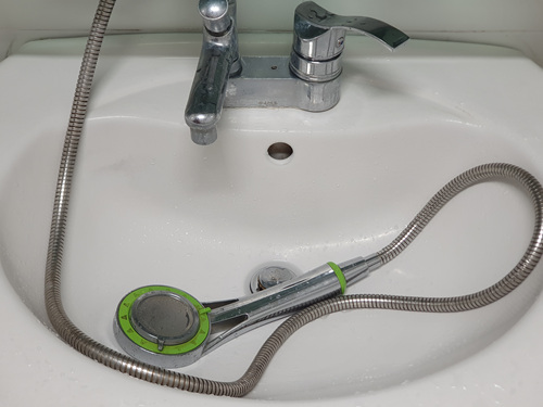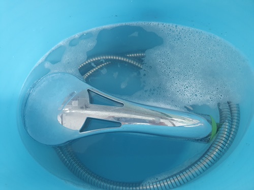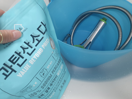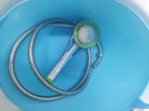 세척할때는 샤워기줄과 샤워기헤드가 완전히 잠길수 있는 통이 필요해요.