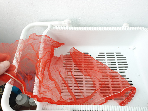 전 구멍 쑹쑹 뚫린 곳위에 양파망을 깔아 공기순환도 잘되고 양파껍질 부스러기가 흐르지 않게 했어요.