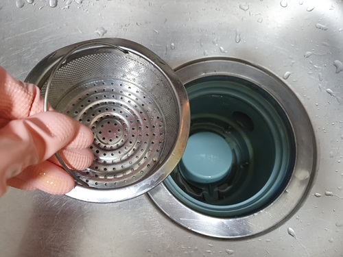 이렇게 딱 맞으니 싱크대 배수구 청소 더 수월하게 되었지요. 구멍사이로 과탄산소다가 다 흘러가지 않으니까요.